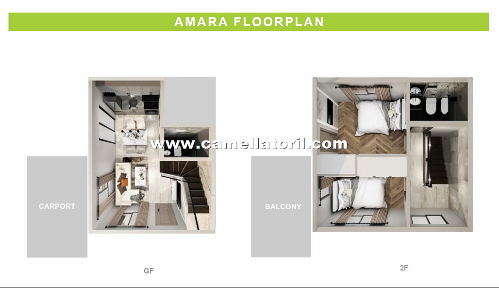 Amara has a lot area of 99 sqm and a house area of 52 sqm (or 72 sqm with balcony option). It's a single attached 2-storey house with two bedrooms, two toilets and baths, a living area, dining area, kitchen, a carport, provision for a balcony, and a laundry and service area. The grand master's bedroom is located at the second floor with exclusive toilet and bathroom. If you want the biggest space and all the extra rooms that you can have, Amara model is for you!